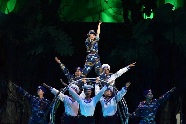 Trong chương trình có sự phối hợp cùng các ca sĩ với các bài hát ca ngợi tình yêu đất nước… Trong đó có thể kể đến hoạt cảnh “Đồng đội” (Bác cùng chúng cháu hành quân – Nhào sào, Đế vòng, Nhào lộn, tốp nam, nữ); Múa hát “Anh Phi công ơi” – Đánh vòng tập thể - Đu dây lụa 4 nam; Hoạt cảnh “Phi đội ta xuất kích” – Đu quay Dây lụa 4 nam; Bầu trời tình yêu – Đu dây đôi nam nữ; “Bài ca người chiến sĩ canh trời”- Dây đôi nữ nam; Hoạt cảnh “Hà Nội Điện Biên phủ trên không” – cầu bật tập thể; Hoạt cảnh “Ước mơ bay cao” – Vòng quay mạo hiểm – đu dây…