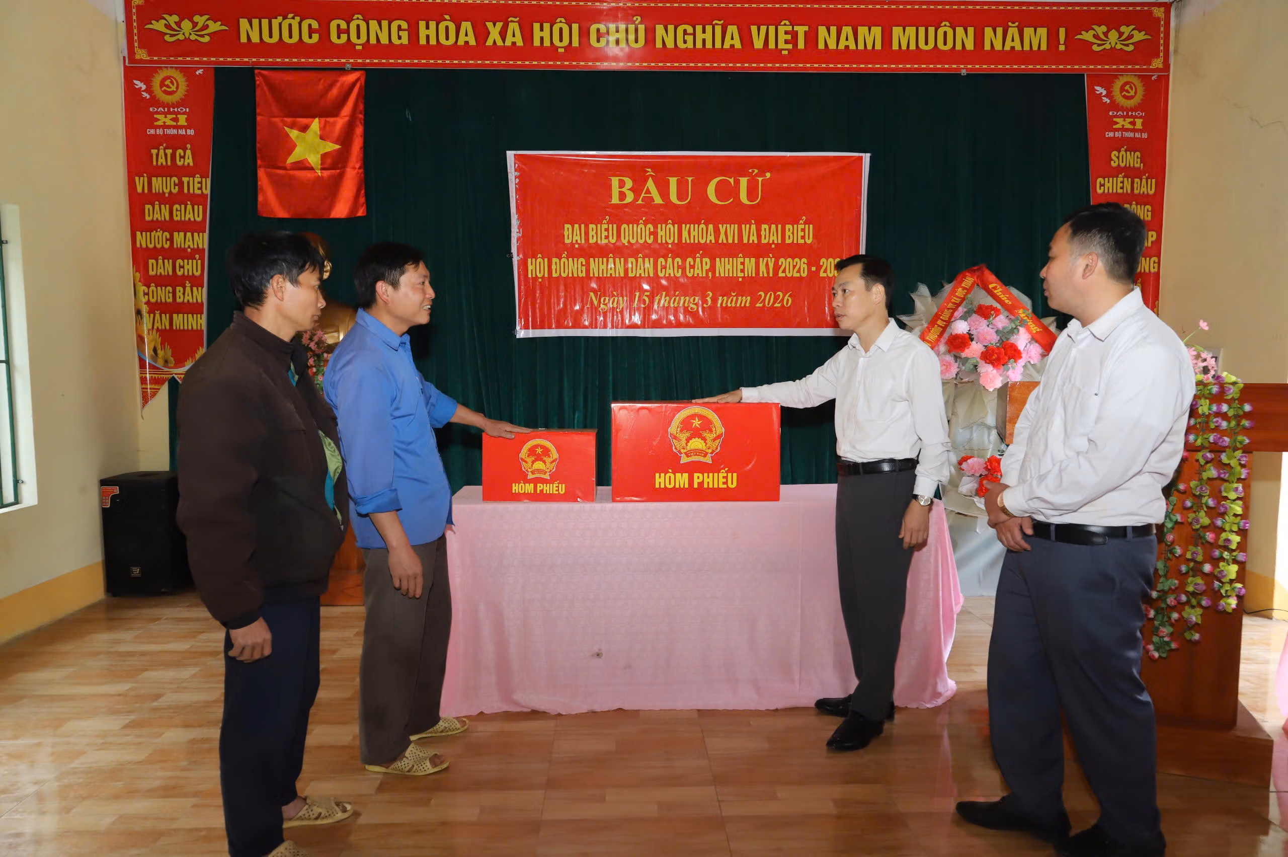 Song song với công tác tuyên truyền, xã cũng tập trung chuẩn bị cơ sở vật chất phục vụ bầu cử. Các khu vực bỏ phiếu được bố trí tại nhà văn hóa thôn hoặc điểm sinh hoạt cộng đồng, bảo đảm thuận tiện cho cử tri đến bỏ phiếu. Hòm phiếu, tài liệu bầu cử, danh sách cử tri và các trang thiết bị cần thiết đã được chuẩn bị đầy đủ. Các tổ bầu cử được thành lập, phân công nhiệm vụ cụ thể và tham gia tập huấn để nắm vững quy trình tổ chức bảo đảm quy trình bầu cử diễn ra đúng quy định, dân chủ, an toàn.