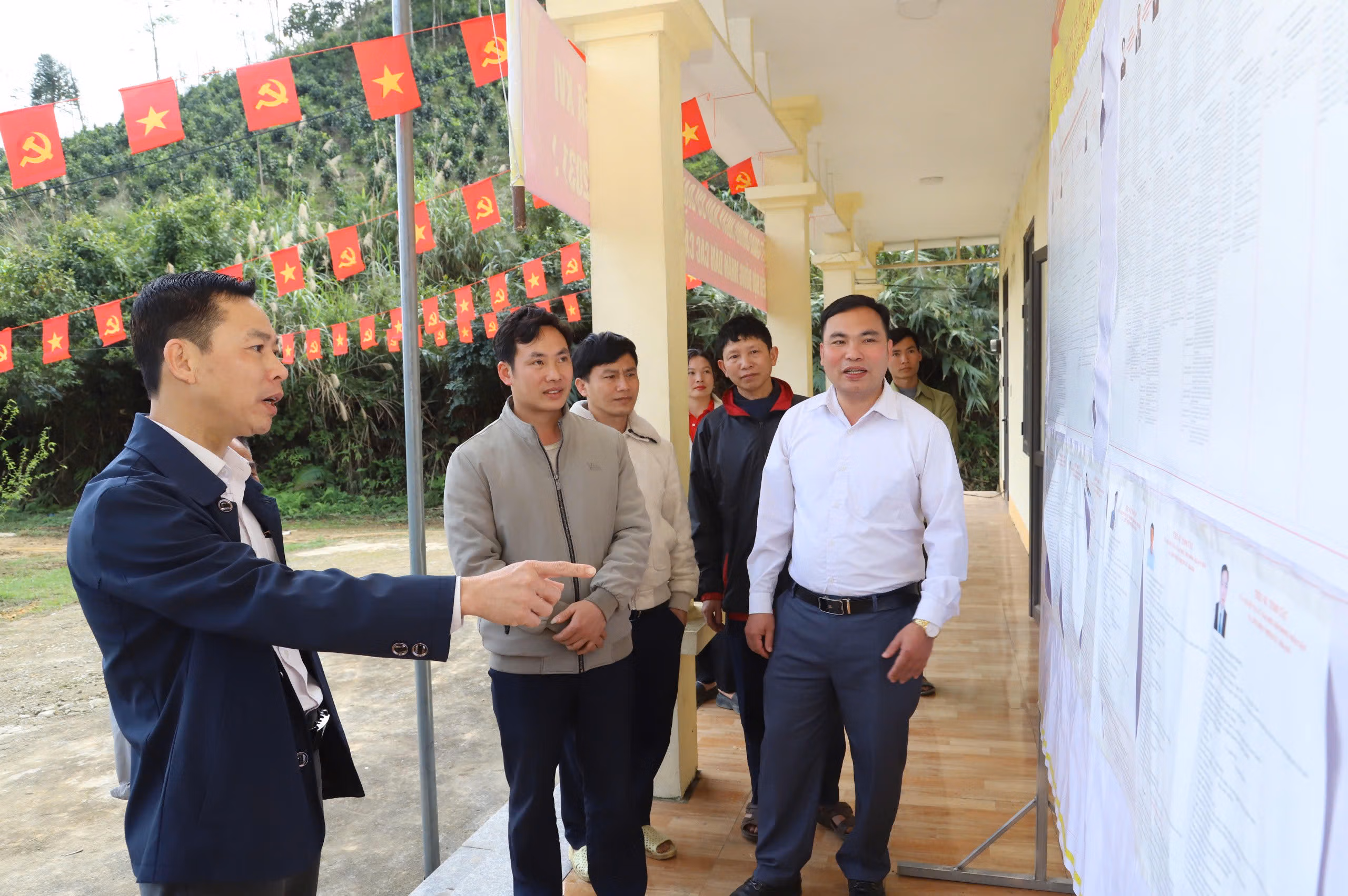 Trên các tuyến đường liên thôn, liên bản, cờ Tổ quốc, băng rôn, khẩu hiệu tuyên truyền về bầu cử được treo trang trọng. Tại trụ sở UBND xã và nhà văn hóa các thôn, bảng niêm yết danh sách cử tri, danh sách và tiểu sử tóm tắt của các ứng cử viên được đặt ở vị trí dễ quan sát để người dân theo dõi, tìm hiểu.