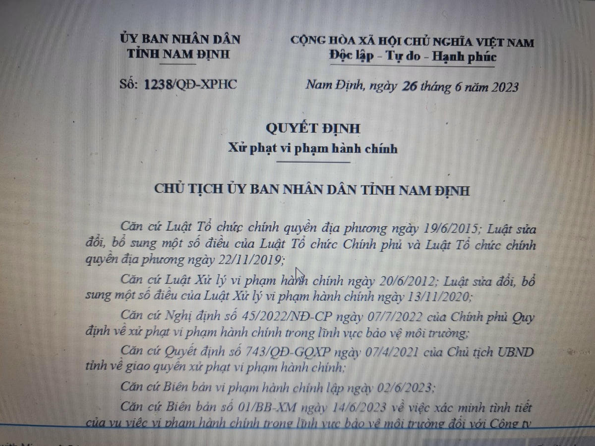 Quyết định cũng được gửi cho Kho bạc nhà nước tỉnh Nam Định để thu tiền phạt; gửi cho Ban Quản lý các khu công nghiệp để tổ chức thực hiện; gửi cho Sở Tài nguyên và Môi trường để biết và phối hợp thực hiện.