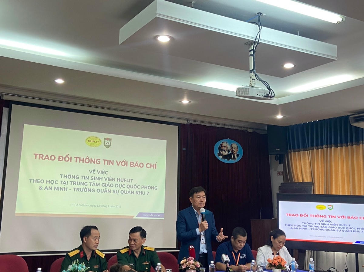 Tại buổi họp báo, đại diện Trường Quân sự Quân khu 7 cho biết, vụ việc xảy ra vào khoảng 21 giờ 30 ngày 10/1/2023 có hai nữ sinh trường Đại học HUFLIT xảy ra tranh cãi trong quá trình sinh hoạt tập thể. Do không làm chủ được cảm xúc cá nhân, một nữ sinh đã la hét, khóc lóc. Ngay sau đó, cán bộ quản lý tại Trung tâm Giáo dục Quốc phòng và An ninh đã giải quyết, không để xảy ra hậu quả. Thông tin sự việc cũng được Trung tâm này thông báo về cho gia đình của nữ sinh, đồng thời kịp thời động viên nữ sinh để ổn định tâm lý.