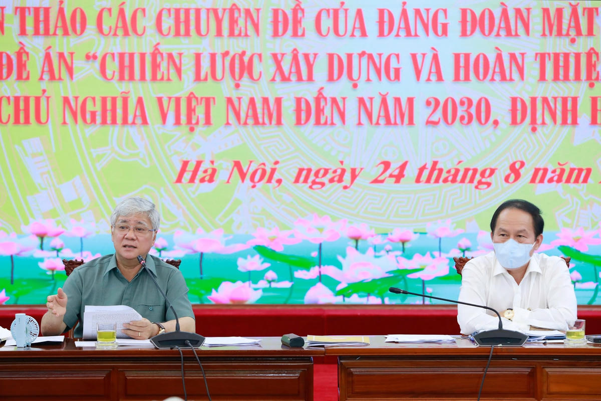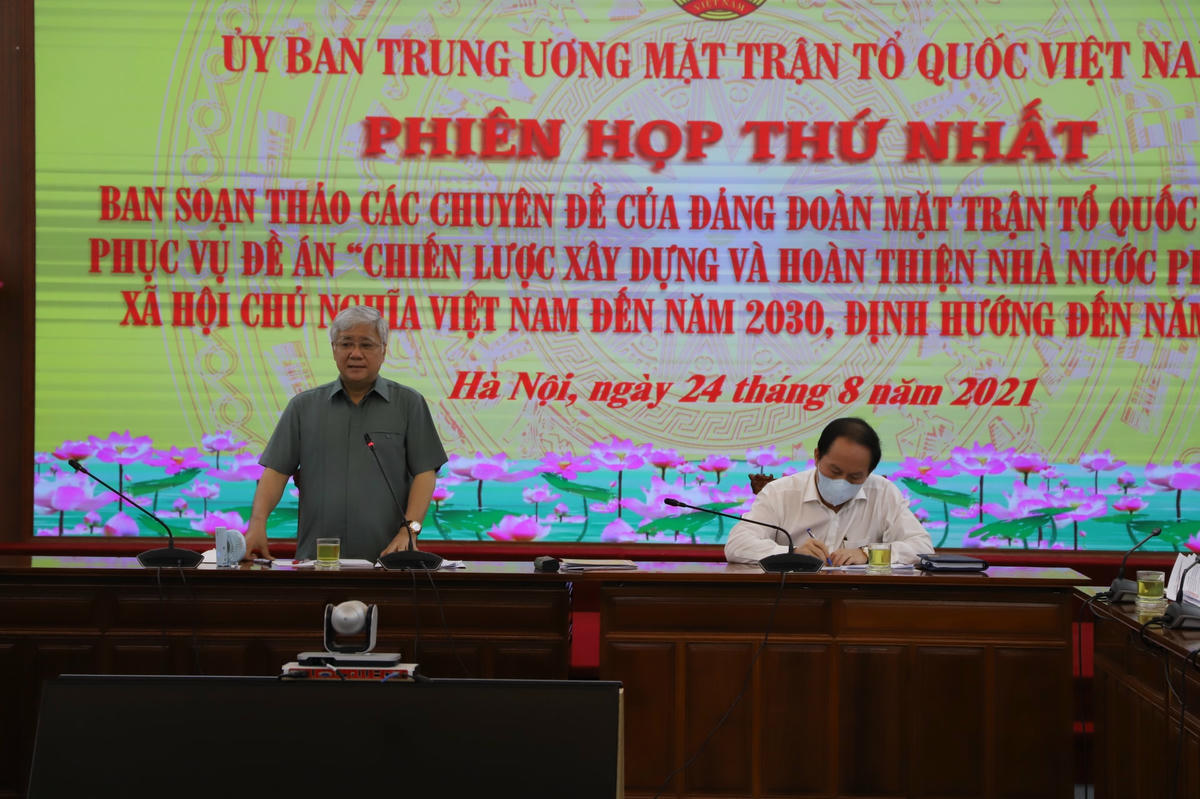 Tại phiên họp, đại diện Tổ biên tập đã báo cáo tóm tắt về việc MTTQ Việt Nam tham gia xây dựng Đề án. Căn cứ Kế hoạch số 02-KH/BCĐ ngày 20/7/2021 của Ban Chỉ đạo xây dựng Đề án "Chiến lược xây dựng và hoàn thiện Nhà nước pháp quyền XHCN Việt Nam đến năm 2030, định hướng đến năm 2045" do Bộ Chính trị thành lập, Đảng đoàn Mặt trận Tổ quốc Việt Nam được phân công chủ trì, phối hợp với các cơ quan, tổ chức liên quan nghiên cứu, xây dựng hai chuyên đề gồm: chuyên đề 26: Phát huy vai trò của Mặt trận Tổ quốc và các tổ chức chính trị - xã hội, các tổ chức xã hội - nghề nghiệp, các tổ chức xã hội đáp ứng yêu cầu xây dựng, hoàn thiện Nhà nước pháp quyền XHCN Việt Nam và chuyên đề 27: Bảo đảm thực hiện, phát huy quyền làm chủ và vai trò chủ thể của nhân dân trong xây dựng, hoàn thiện Nhà nước pháp quyền xã hội chủ nghĩa Việt Nam.