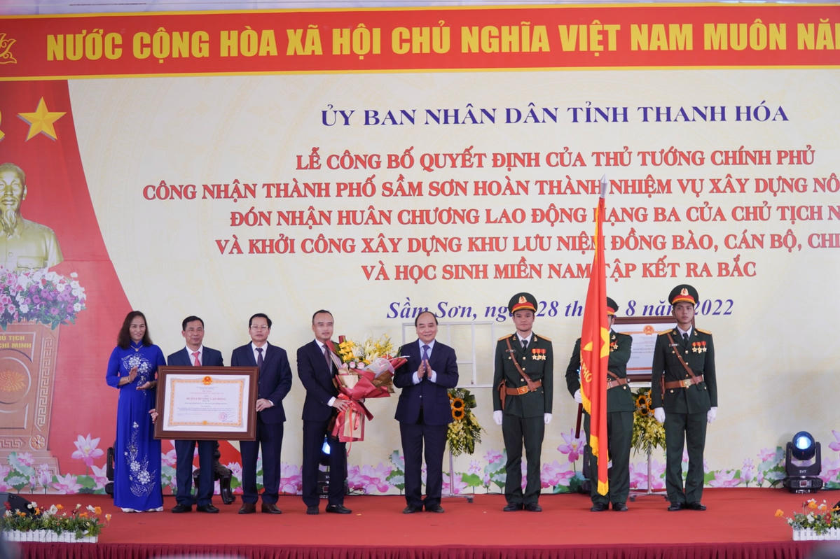 Trong khuôn khổ chuyến thăm và làm việc tại Thanh Hóa, ngày 28/8, Chủ tịch nước Nguyễn Xuân Phúc đã cùng đoàn công tác dư lễ công bố Quyết định của Thủ tướng Chính phủ công nhận TP Sầm Sơn hoàn thành nhiệm vụ xây dựng nông thôn mới (NTM) và đón nhận Huân chương Lao động hạng Ba.