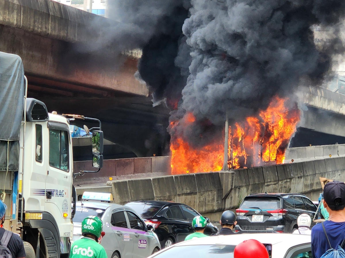 Tại hiện trường, chiếc xe khách bốc cháy hoàn toàn, cột khói từ vụ cháy bốc cao hàng chục mét. Vụ việc khiến giao thông qua lại đường Vành đai 3 trên cao và đường Khuất Duy Tiến (hướng Thanh Trì) bị ùn ứ.
