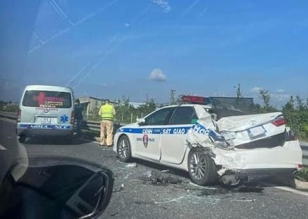 Theo quan sát tại hiện trường, xe của lực lượng CSGT bị nát phần đuôi, móp méo nhiều chỗ. Đèn và kính, cốp thùng phía sau cũng bị vụ tai nạn làm cho hư hỏng nặng. Xe CSGT đậu nằm sát mép vạch kẻ màu trắng của làn đường cao tốc.