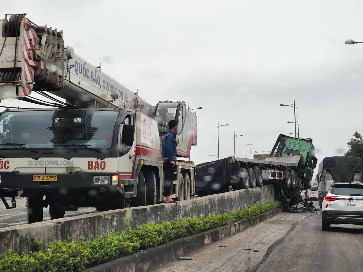 Xe đầu kéo treo lơ lửng trên lan can cầu vượt, hàng trăm tấm xi măng đổ xuống đường