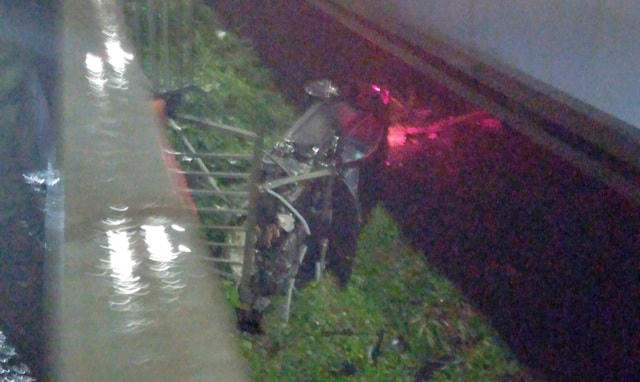Vừa lên dốc cầu Sài Gòn, chiếc xe ô tô hiệu Porsche bất ngờ lao qua trái, húc gãy lan can cầu, rơi xuống bãi đất dưới gầm cầu.