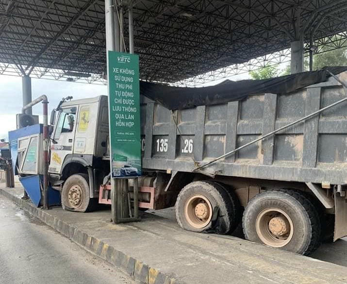 Xe tải tông hỏng cabin trạm thu phí sau khi va chạm với ô tô