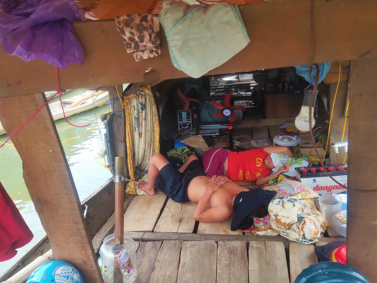 Xóm chài Thành Công nằm dưới chân cầu Sâng đang có gần 30 hộ dân sinh sốnDưới cái nắng gay gắt, anh Nguyễn Văn Hưng (sinh năm 1982) phải liên tục dội nước lên thuyền nhằm làm giảm nhiệt. “Thuyền lợp mái tôn nên nắng nó chiếu vào nóng lắm chú à, tôi dội nước liên tục mà chẳng ăn thua” anh Hưng chia sẻ.Anh Nguyễn Văn Lợi (42 tuổi) hiện đang sống cùng vợ và 3 người con. Trước cái nắng như đổ lửa, dù đã bật quạt hết công suất nhưng cả anh và đứa con trai út đều phải cởi trần cho đỡ nóng.Điện được người dân xóm chài kéo về từ các hộ dân trên bờ. Trong khi giá điện trên bờ chỉ khoảng 3000đ/số thì khi kéo xuống đây sẽ lên tới 5000đ/số. Vì vậy nhiều người phải chuẩn bị quạt tay để dùng cho đỡ tốn tiền.Một cặp vợ chồng tranh thủ chợp mắt trong khoang thuyền nóng hầm hậpDo phải mua nước sạch với giá đắt đỏ nên việc chế biến cá, giặt giũ, tắm rửa…. đều phải dùng nguồn nước sông ô nhiễm.Gia đình anh Thắng được xem là “có điều kiện” khi có tới 2 chiếc quạt trên thuyềnGiữa cái nóng hơn 40 độ C, dù đã dỗ dành nhưng nhiều đứa trẻ xóm chài vẫn không ngủ được.Dù nóng hầm hập trong thuyền nhưng người dân vẫn cố gắng chợp mắt để tiếp tục làm việc vào buổi chiều.