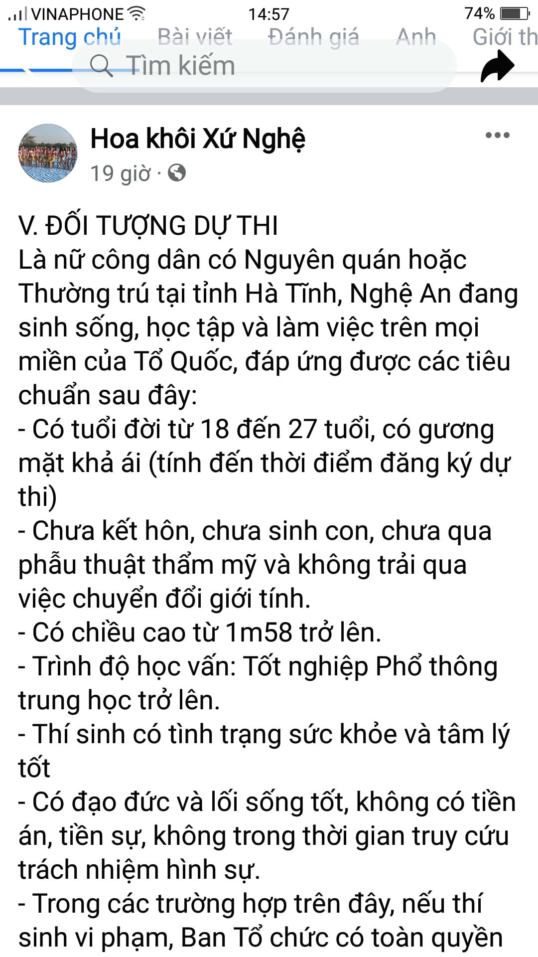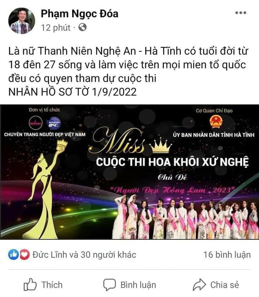 Sau đó, Facebook này tiếp tục đăng tải thông tin về việc tổ chức cuộc thi “Hoa khôi xứ Nghệ” với đầy đủ đối tượng dự thi, nội dung cuộc thi và thông báo chính thức nhận hồ sơ từ ngày 2/9/2022 đến 31/12/2022.