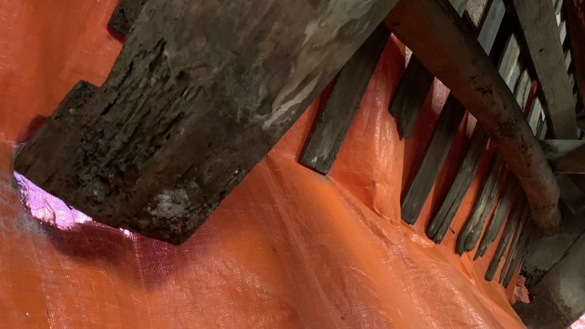 Ngoài ra, phần mái ngói phía sau hậu cung cũng bị sạt, ngói cổ bị rơi vỡ một phần. Nhiều xà, kèo bằng gỗ có hiện tượng mọt, mục và nguy cơ gãy rất cao. Hai bức tường đầu hồi và toàn bộ mái khu vực hậu cung thờ Đức Thánh Cả có nguy cơ đổ sập bất cứ lúc nào.