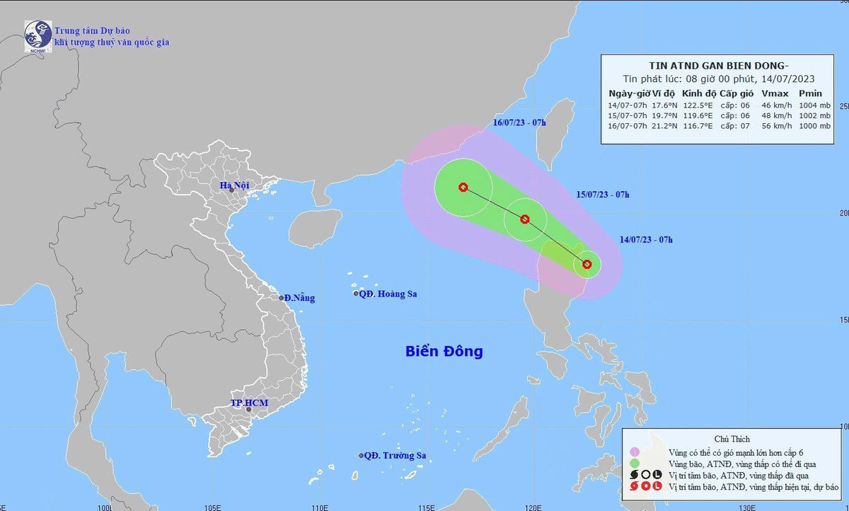 Trước đó, theo Trung tâm Dự báo khí tượng thủy văn quốc gia, hồi 7h sáng nay (14/7), tâm áp thấp nhiệt đới nằm trên khu vực vùng biển phía Đông đảo Luzon (Philippines); sức gió vùng gần tâm áp thấp nhiệt đới mạnh cấp 6, giật cấp 8.