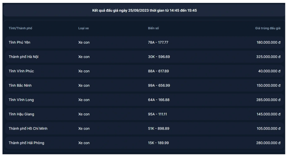 Biển 78A-177.77 trúng đấu giá với số tiền 180 triệu đồng. Biển 30K-596.69 trúng đấu giá với số tiền 325 triệu đồng. Biển 88A-617.89 trúng đấu giá với số tiền 40 triệu đồng. Biển 99A-656.99 trúng đấu giá với số tiền 150 triệu đồng. Biển 64A-166.88 trúng đấu giá với số tiền 285 triệu đồng. Biển 95A-111.11 trúng đấu giá với số tiền 145 triệu đồng. Biển 51K-898.89 trúng đấu giá với số tiền 105 triệu đồng. Biển 15K-189.99 trúng đấu giá với số tiền 280 triệu đồng.