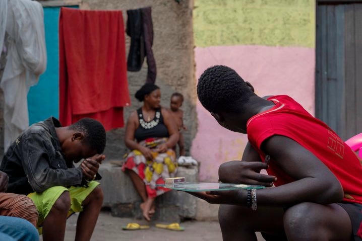 Trong căn lều bỏ hoang ở ngoại ô Kinshasa, một thanh niên tìm kiếm sự lãng quên khi lấy một túi bột màu nâu trộn với thuốc lá, thuốc an thần và bột dinh dưỡng đã nghiền nát. Sau đó, anh ta cùng bạn hít hỗn hợp "bombe". Vài phút sau, những người này chậm rãi lắc lư, tự cào cấu mình.